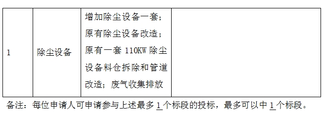 2、 工程(项目)规模:新增除尘设备一套;原有一套110KW除尘设备改造;废气收集排放,详见招标内容;