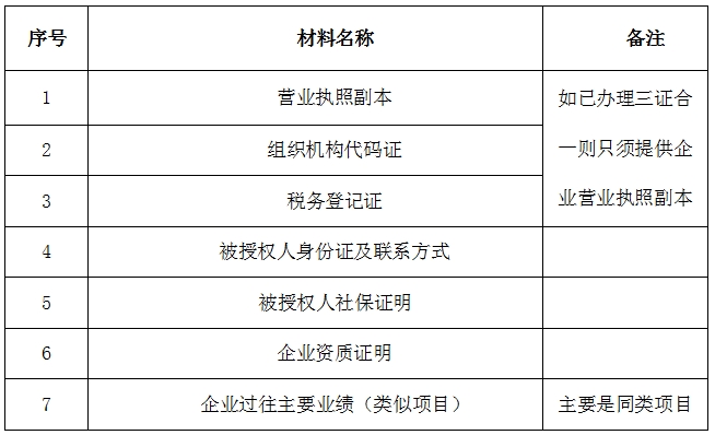 2、 凡有意向参加投标者,请在上述期间内按下表提供报名资料,相关证明文件的原件如无法提供原件则提供复印件加盖公司公章,投标人须将上述资料的扫描件发邮件至招标联系人处进行报名。