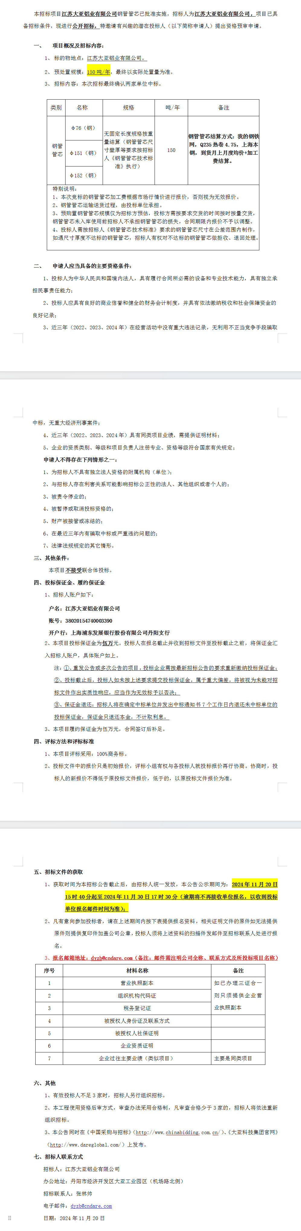 江苏大亚铝业有限公司钢管管芯招标公告
