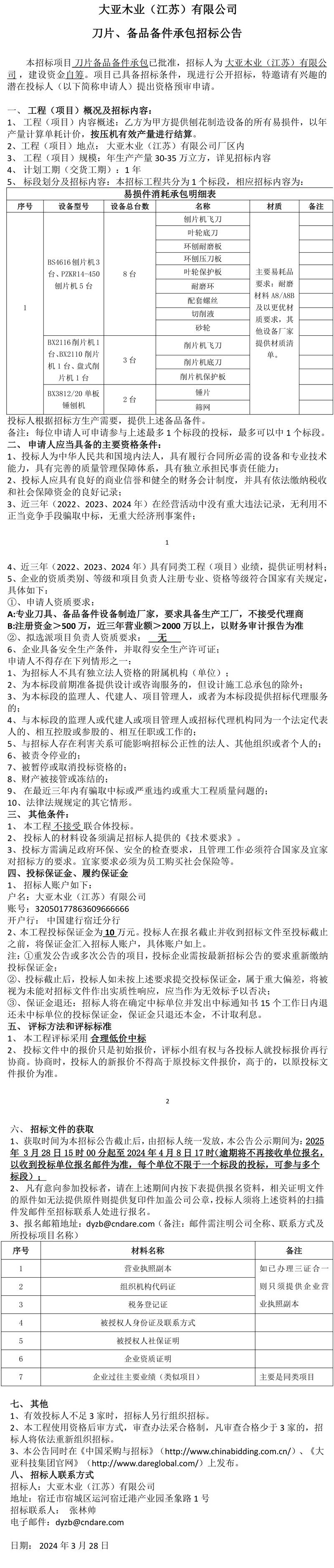 大亚木业(江苏)有限公司刀片、备品备件承包招标公告