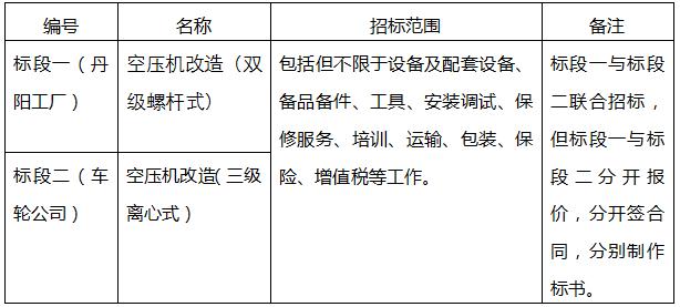 标段一为双级螺杆式空压机3台及流量计控制器等;标段二为三级离心式空压机1台、零气耗压缩热吸干机1台及开关柜流量计等。详见招标文件。