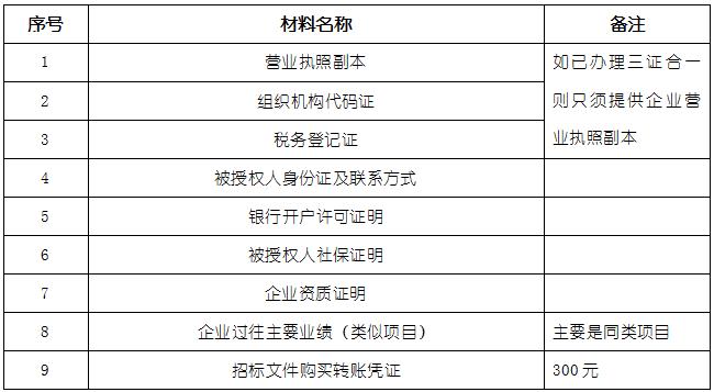 2、 凡有意向参加投标者,请在上述期间内按下表提供报名资料,相关证明文件的原件如无法提供原件则提供复印件加盖公司公章,投标人须将上述资料的扫描件发邮件至招标联系人处进行报名。