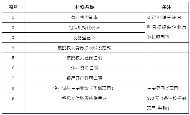 2、凡有意向参加投标者,请在上述期间内按下表提供报名资料,相关证明文件的原件如无法提供原件则提供复印件加盖公司公章,投标人须将上述资料的扫描件发邮件至招标联系人处进行报名。