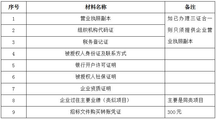 2、 凡有意向参加投标者,请在上述期间内按下表提供报名资料,相关证明文件的原件如无法提供原件则提供复印件加盖公司公章,投标人须将上述资料的扫描件发邮件至招标联系人处进行报名。