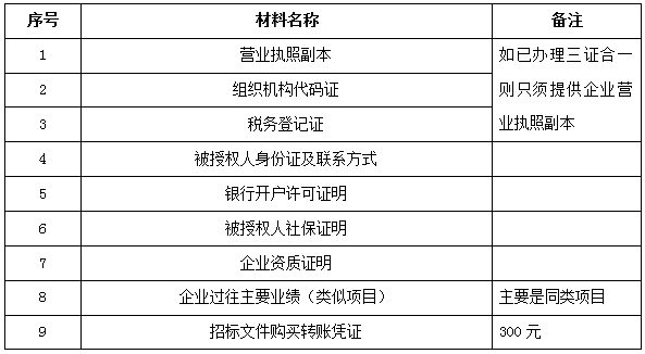 2、 凡有意向参加投标者,请在上述期间内按下表提供报名资料,相关证明文件的原件如无法提供原件则提供复印件加盖公司公章,投标人须将上述资料的扫描件发邮件至招标联系人处进行报名。