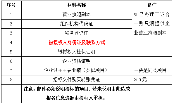 2、 凡有意向参加投标者,请在上述期间内按下表提供报名资料,相关证明文件的原件如无法提供原件则提供复印件加盖公司公章,投标人须将上述资料的扫描件发邮件至招标联系人处进行报名。