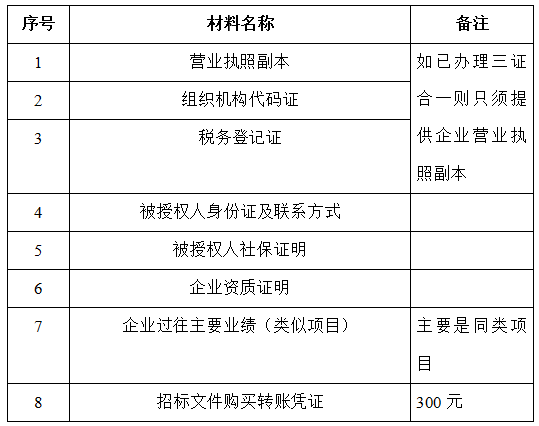 2、 凡有意向参加投标者,请在上述期间内按下表提供报名资料,相关证明文件的原件如无法提供原件则提供复印件加盖公司公章,投标人须将上述资料的扫描件发邮件至招标联系人处进行报名。