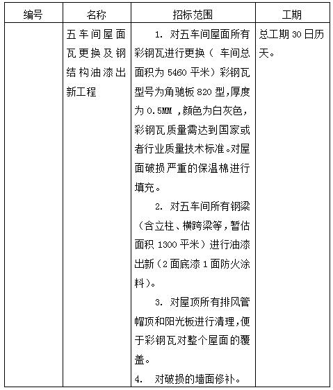 彩钢瓦进行更换车间总面积为5460平米,五车间所有钢梁含立柱、横跨梁等,暂估面积1300平米,进行油漆出新以及其他零星墙面修补。