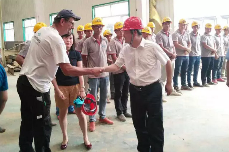 在项目建设安装现场,仲总向奋战在一线的中外工程建设人员赠送了慰问品,对全体建设者展现出的大亚人特有的“追求卓越,挑战极限;创新发展,敢于担当”精神风貌表示由衷的敬意。仲总带领大家深入设备安装现场、厂房、堆场等详细察看和了解项目建设与推进进度、工程质量与安全,并嘱咐大家一定要做好防暑降温工作,保证全体中外建设人员的安全与生活,特别强调了设备安装质量和安全,按康总确立的三个建设时间节点的目标有序推进,确保按时、保质、安全完成设备安装和项目整体建设任务,努力把该项目建设成全球人造板行业精品工程。