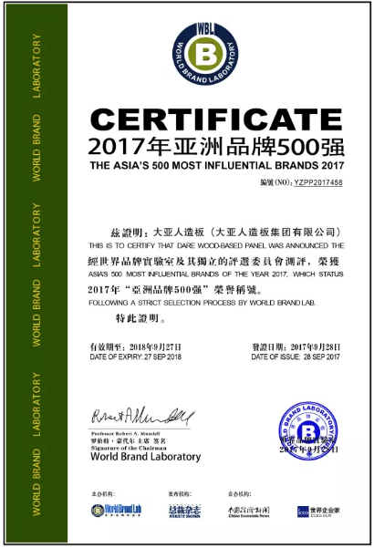 由世界品牌实验室和世界经理人集团共同编制和发布的2017年《亚洲品牌500强》排行榜于9月28日在香港揭晓,这是世界品牌实验室第十二次对亚洲品牌的影响力进行的测评, 共有20个国家和地区的500个品牌入选,中国、日本和韩国是入选品牌最多的三个国家。《亚洲品牌500强》的评判标准是品牌的亚洲影响力,品牌影响力是指品牌开拓市场、占领市场、并获得利润的能力。大亚人造板凭借在人造板行业多年的领导力、市场占有率和品牌忠诚度成功入选《亚洲品牌500强》!