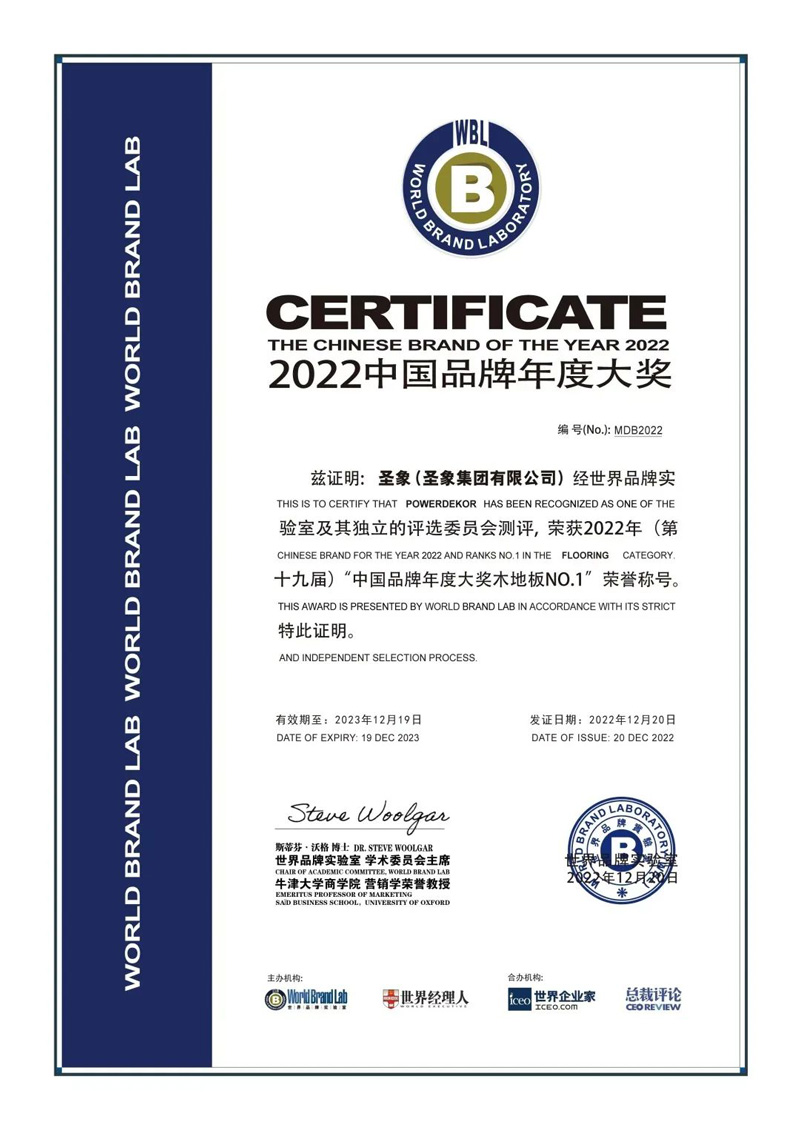 2022年12月20日,第十九届“中国品牌年度大奖”评选在“世界经理人峰会”上揭晓。这项被誉为“中国品牌奥斯卡”的年度奖项,由业界权威机构世界品牌实验室(World Brand Lab)在上海颁发。圣象荣获2022年(第十九届)“中国品牌年度大奖木地板NO.1”。